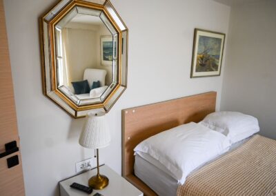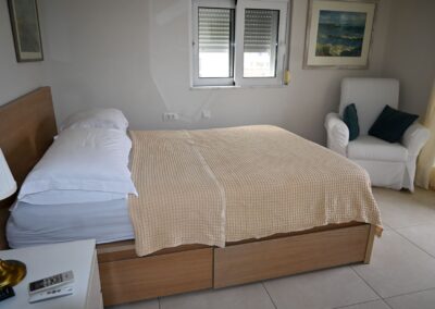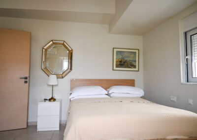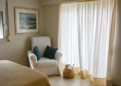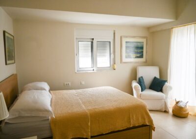 The bedroom offers a comfortable double bed and a cozy sofa, providing a relaxing space for two guests. Designed with comfort in mind, the room features soft lighting and a welcoming atmosphere, making it the perfect retreat to rest and recharge after a day exploring Rhodes.
