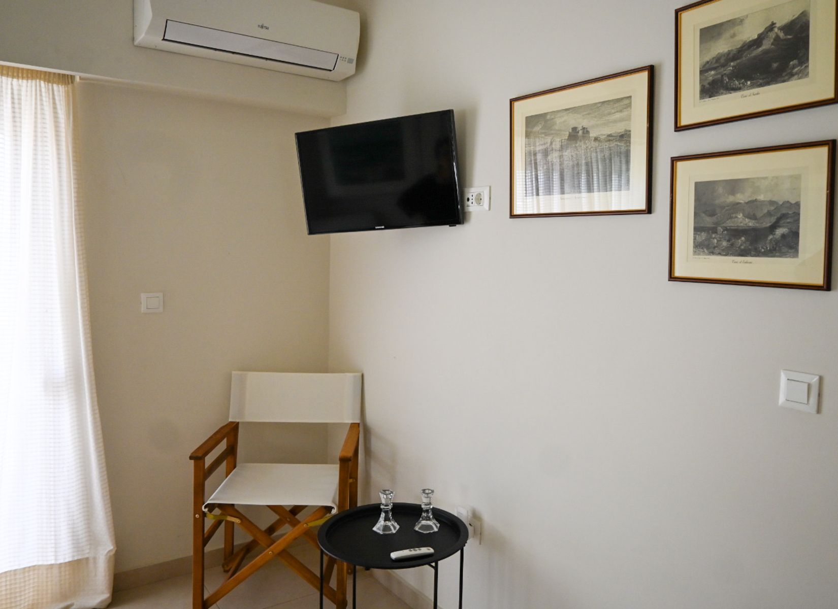 The bedroom offers a comfortable double bed and a cozy sofa, providing a relaxing space for two guests. Designed with comfort in mind, the room features soft lighting and a welcoming atmosphere, making it the perfect retreat to rest and recharge after a day exploring Rhodes.